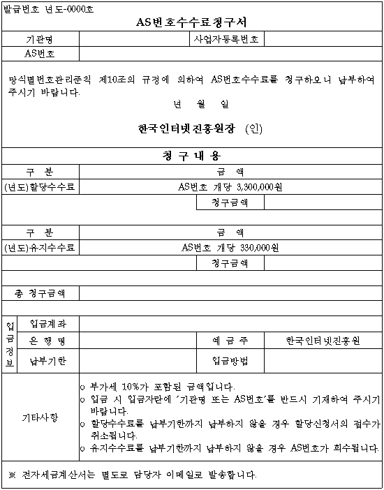 4. 진흥원은 할당수수료의 입금이 확인된 경우 별지 제1호서식에 따라 AS번호 할당을 통보한다.