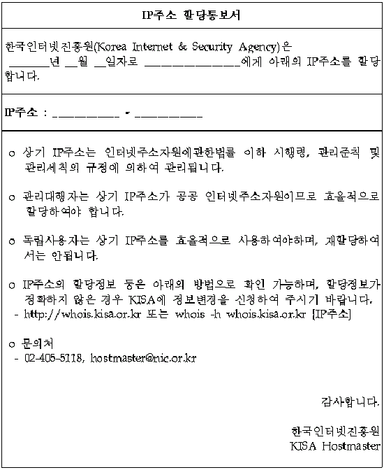 - 4. 진흥원은 관리대행자의 IP주소 할당승인신청을 승인하는 경우 관리대행자에게 통보한 후 할당정보를 데이터베이스에 등록하고 진흥원에서 제공하는 WHOIS를 통해 공개한다.