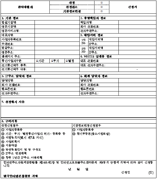 - 1. 관리대행자가 사용자에게 IP주소를 할당하고자 하는 경우 별지 제2호서식에 따라 할당승인신청서를 진흥원에 제출하여야한다.