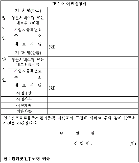 [별지 제4호서식]IP주소 이전신청서 샘플 양식입니다.
