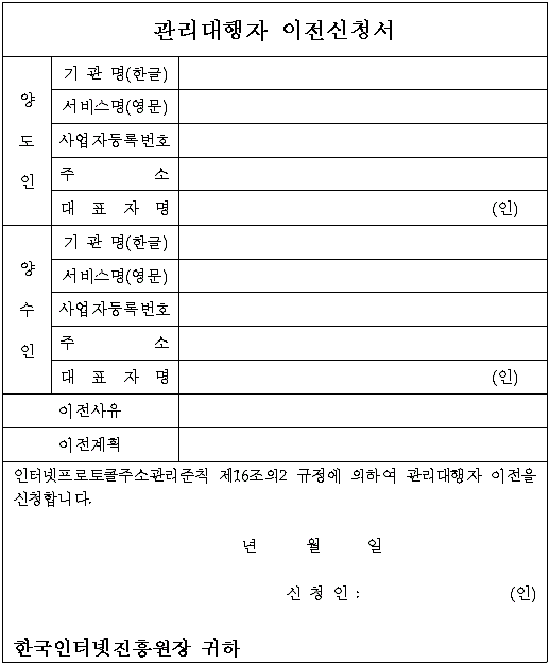 인터넷프로토콜주소관리준칙 제16조의2 규정의 의하여 관리대행자 이전을 신청합니다.