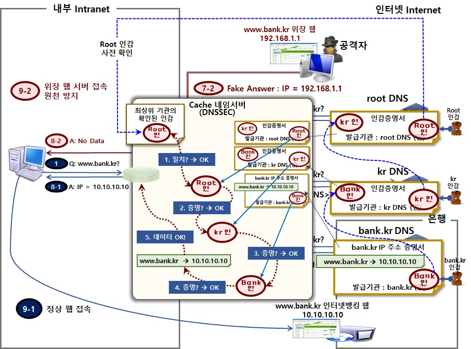 DNSSEC은 공개키 암호화방식의 전자서명 메커니즘을 DNS 체계에 도입하여 적용하는 방법으로써 DNS의 "데이터 위-변조" 취약점을 보강하여 보안 안정성을 대폭 강화하였습니다.