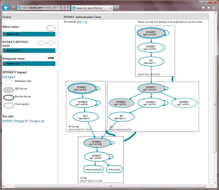 DNSViz는 루트 존으로부터 최상위도메인 존, 그리고 최종 점검대상 도메인 존에 이르는 도메인의 서명연결 구조도가 이미지로 출력됩니다. 문제가 있는 요소의 경우는 아이콘으로 표시되어 설정오류 문제를 쉽게 파악할 수 있게 해 줍니다. 각 요소의 위에 마우스를 가져다 놓으면 관련된 정보가 팝업으로 표시됩니다. DNSViz는 위의 대표 페이지 외에 탭(tab)으로 세부사항을 확인할 수 있도록 구성해 놓고 있습니다.