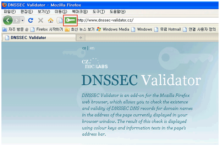 인터넷브라우저에서 http://www.dnssec-validator.cz 에 접속하였을때, 해당 사이트의 주소가 도메인에 DNSSEC이 적용 되었다면, 주소창의 주소 앞에 초록색 열쇠그림이 표시됩니다.