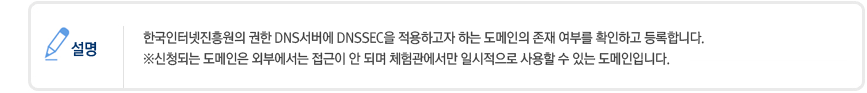 한국인터넷진흥원의 권한 DNS서버에 DNSSEC을 적용하고자 하는 도메인의 존재 여부를 확인하고 등록합니다.