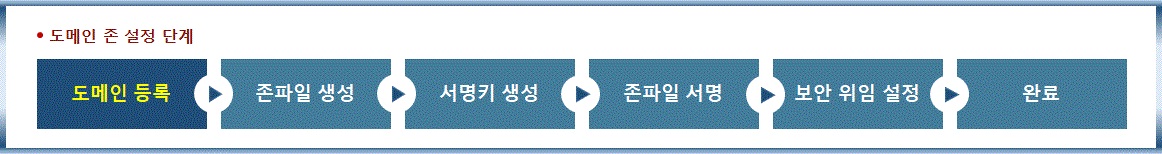 도메인 등록(현재단계), 존파일 생성, 서명키 생성, 존파일 서명, 보안 위임 설정, 완료