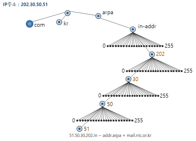 1. IP 주소(202.30.50.51)를 역순으로 나열합니다. 나열 할때 DNS처럼 수직 방향으로 나열합니다. 2. 51이 최하위 이며, 202가 최상위가 됩니다. -> 51.50.30.202 3. 역순으로 나열된 IP 주소 상위에 in-addr를 붙입니다. -> 51.50.30.202.in-addr 4. 마지막으로 최상위에 arpa 를 추가 합니다. -> 51.50.30.202.in-addr.arpa 5. arpa 는 인터넷 기반시설의 운용을 위해 사용되는 특수 최상위 도메인 이며, .kr 과 동급입니다.
