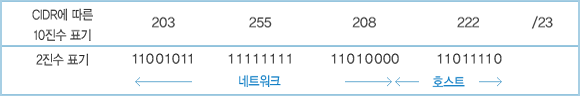예를 들어 “203.255.208.222/23”과 같은 CIDR에 의한 IPv4주소표기 방식은 IP주소를 2진수 표기법으로 변환하였을 때 나타나는 처음 23비트(11001011 1111111 1101000)가 네트워크 주소로 사용되며 나머지 비트(0 11011110)가 /23 네트워크가 가지는 512개의 호스트 중 자신의 호스트를 식별하는 숫자라는 것을 말합니다.