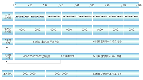 정책적 경계 | 0000:0000:0000:(상위넷) (정책적 경계선) 0000:(하위넷) | 64비트 인터페이스 주소 부분 | ||||||