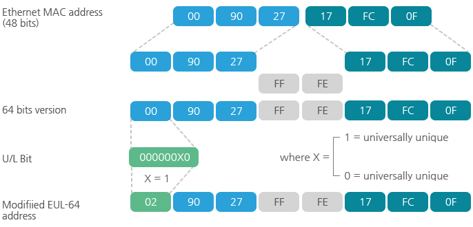 EUI-64 방식은 MAC 주소 48비트를 기반으로 ‘FFFE’를 결합하여 전체 IPv6 크기 중 하위 64비트 부분인 인터페이스 ID정보를 생성하는 방식으로 RS, RA 메시지를 이용한 /64의 프리픽스와 EUI-64 방식의 인터페이스 ID부분이 결합하여 IPv6 주소를 설정한다.