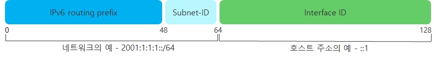 ::1 | All node multicast | FF01::1 (인터페이스 내부) FF02::1 (링크 내부) |
